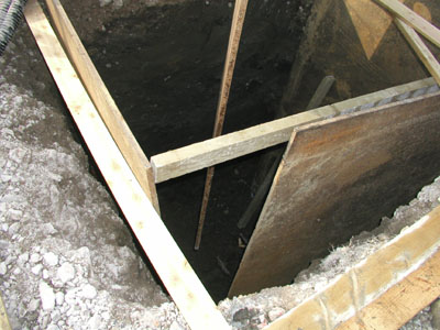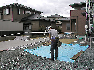 土地は3メートル掘っても水が出てこなく粘土質の土壌のため耐圧は充分ある。4面に鉄板を入れて補強してある。 アース用の銅板を敷き、アース棒を数本打ち込みし、土を戻している。 |