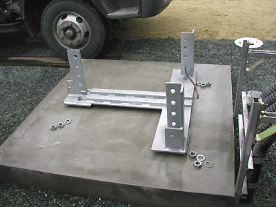 T型マウントを基礎ボルトに固定したところ。 右奥に見える線はアース線。あとでタワーに固定する。 |