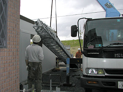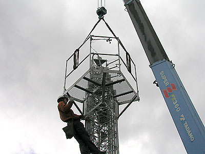 基礎部までゆっくりと移動していく。 タワーの1辺にケーブルガイドが付いているのでケーブルの上下による動きについて確認し、タワーの建てる方向を決める。 |