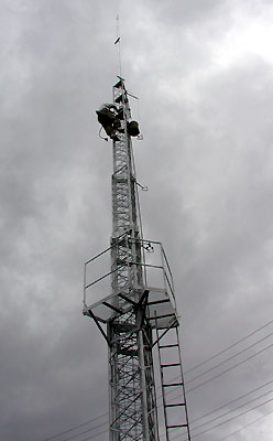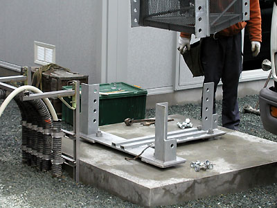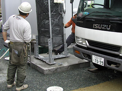 ボルトでマウントに固定していく。 タワー下部には保安のためプラスチックのネットが巻いてある。 |