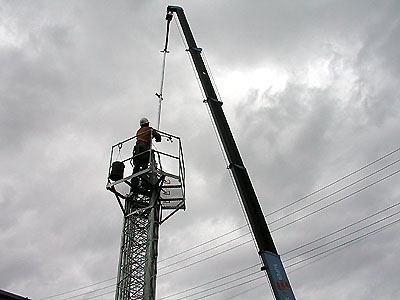 いよいよタワーの建て方を始める。 タワー先頭にロープをかけてクレーンで吊り上げる。 |