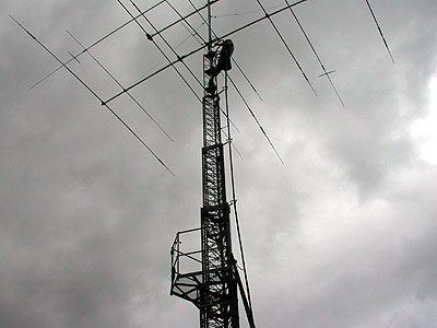 アンテナが上がったら、ケーブル処理。同軸4本、リレー切替1本、ローターケーブル1本の6本をまとめてテーピングする。 まとめたケーブルをガイドに通す。 1日目の作業はここまでで日没となった。 |