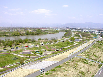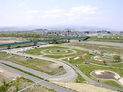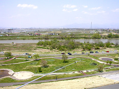 北西方向。ヨーロッパ方向で北からずっと開けている。奥が寒河江市で橋が国道112号。遠くに月山が見える。 寒河江市方面からだと2Km先くらいからタワーが見える。 コンテストでのビーム方向はほとんどが北を中心とした東西60度なので、その範囲は最上川と公園になっている。 |