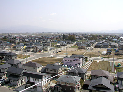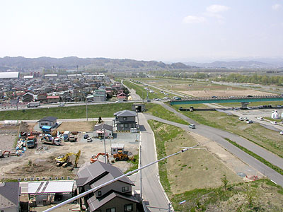 作業完了後、点検を兼ねてタワーをフルアップした状態で写真を撮ってくれた。危険なので素人はやらないように。 北方向。奥に見えるのが最上川で手前が公園になっている。 |